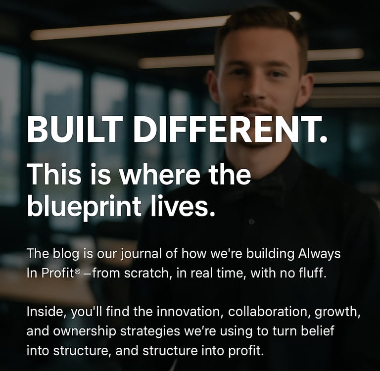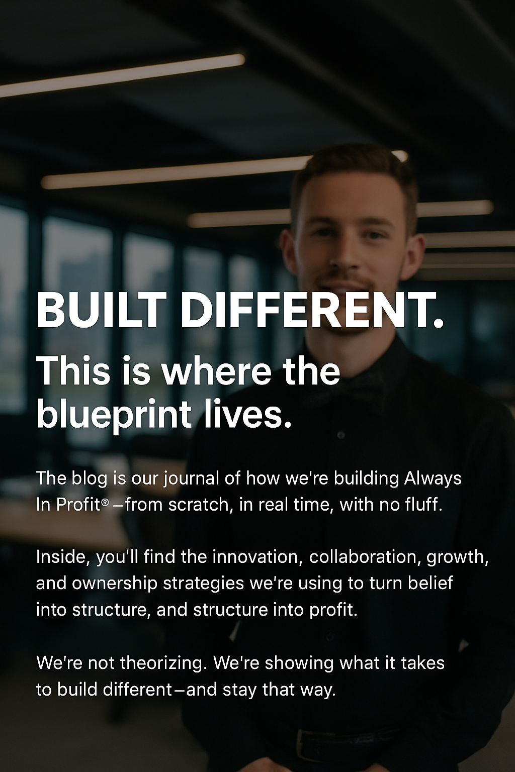 This is where the blueprint lives. The blog is our journal of how we’re building Always In Profit®—from scratch, in real time, with no fluff. Inside, you’ll find the innovation, collaboration, growth, and ownership strategies we’re using to turn belief into structure, and structure into profit. We’re not theorizing. We’re showing what it takes to build different—and stay that way.